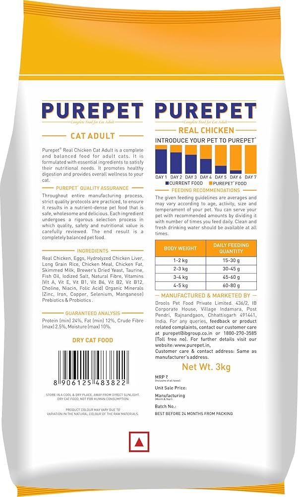 Indulge your feline friend with Purepet Cat Adult Dry Food, featuring real chicken as the primary ingredient. This 3kg pack delivers a complete and balanced nutrition specifically formulated for adult cats, ensuring they stay healthy and active. Enriched with essential vitamins and minerals, it promotes strong bones, a shiny coat, and overall well-being. Treat your cat to a delightful meal that’s both tasty and nutritious! Perfect for everyday feeding, it keeps your pet satisfied and happy. Shop now in our Best Offers category for unbeatable value!